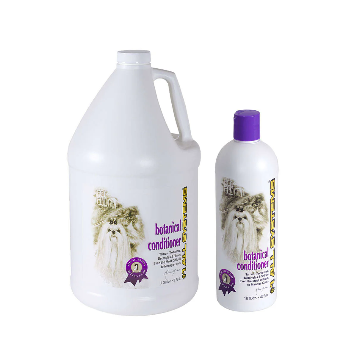 Botanical Conditioner is formulated from botanical extracts for superb instant conditioning, texture and shine. Especially recommended for the difficult to manage coats, such as the Bichon Frise’, Cottony or Silky Coated Poodles, Cottony Coated Afghan Hounds, Shih-tzu, most American Cockers. It will enhance the coat texture and help prevent matting. Excellent for all breeds. Keeps coats free of static, smooth and silky. Will not weigh down the coat or build up. Greatly reduces matting and tangling, and gives the coat a finished look essential for that winning edge.