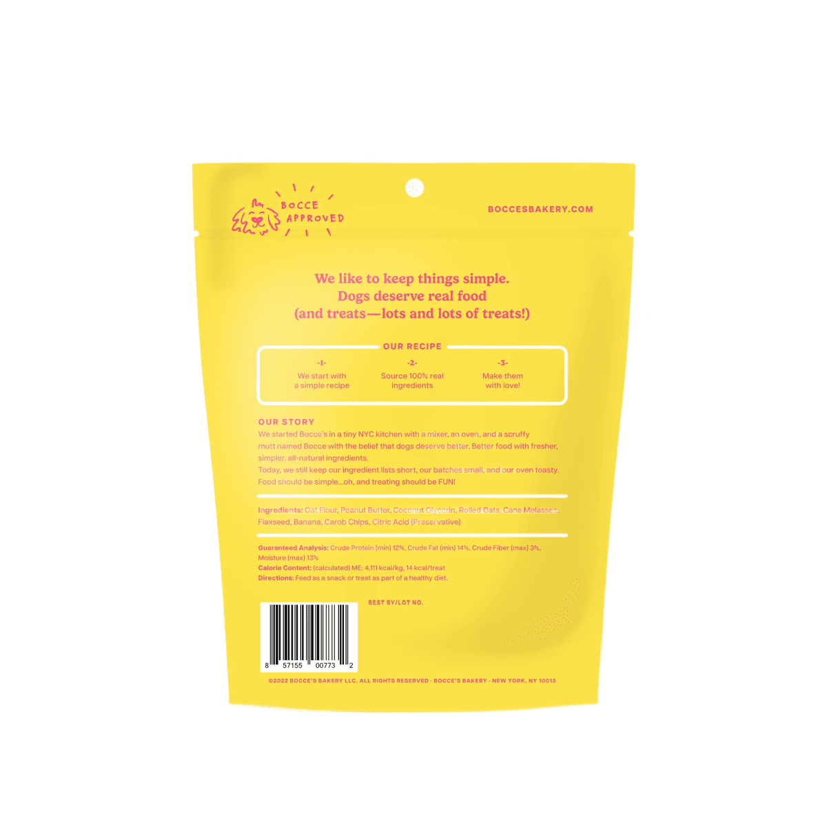 Ingredients – Oat Flour, Peanut Butter, Coconut Glycerin, Rolled Oats, Cane Molasses, Flaxseed, Banana, Carob Chips, Citric Acid (Preservative)