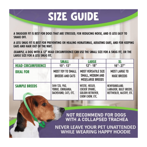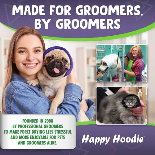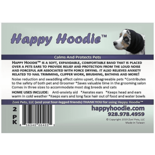 Happy Hoodie is a soft, expandable, fabric band. It’s gentle compression reduces noise and has a swaddling effect that relieves anxiety and calms pets during stressful situations. Happy Hoodie was originally created to calm and protect dogs and cats from the loud noise and high-pressured air associated with force drying in the grooming salon. It proved to be so effective at relieving anxiety that it is now used to help calm pets during any stressful situation, whether it’s at the grooming salon or in the home. Â