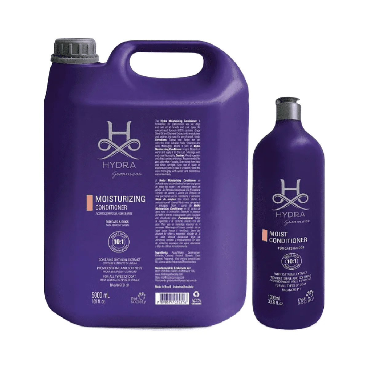 The Hydra Moisturizing Conditioner, by Pet Society, is an exclusive and extremely concentrated formula that allows a dilution of 10:1, making it an economical choice. Moisture Conditioner is formulated for professional use on both dogs and cats, and contains grape seed oil and oat extract to moisturize and soothe the skin and coat.