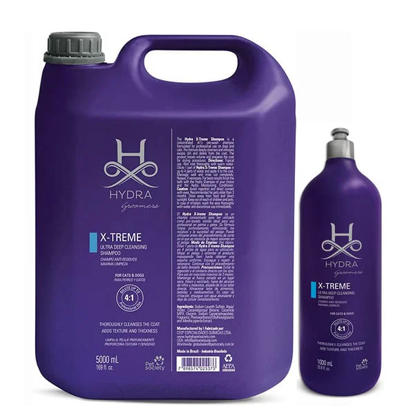 Hydra X-Treme Shampoo is a concentrated 4:1 pre-wash formulated for professional use on dogs and cats. This formula deeply cleanses and removes excess dirt and debris from the coat, boosting volume and preparing the coat for styling procedures.