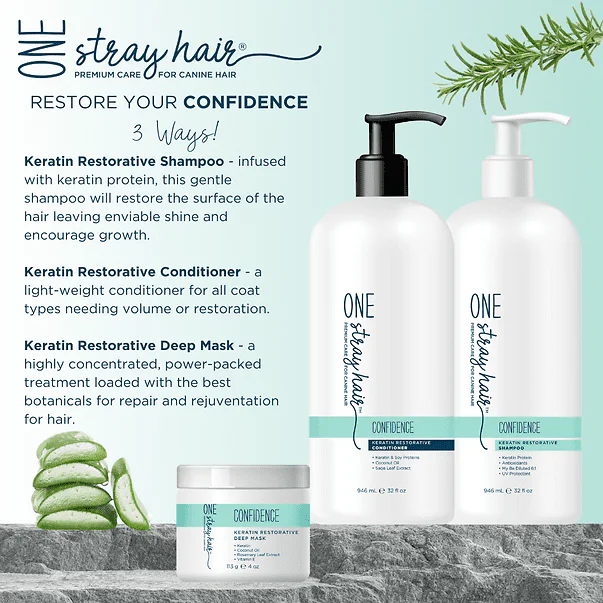 Wet coat thoroughly with cool (not as warm as you would use on your own hair) water, massage a proportionate amount of Confidence Keratin Restorative Shampoo throughout. May be diluted 6:1 to help disperse in a dense coat. Rinse thoroughly. Repeat if necessary. Follow with Confidence Keratin Restorative Conditioner.